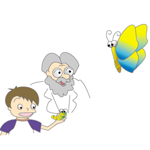 「どれどれ。ほれ、ゆうき君よーく見てごらん。例えばな、蝶は、決まった順番で、こんなにも形を変えながら成長していくだろう。これは、ゲノムのしわざなんじゃよ。」 |